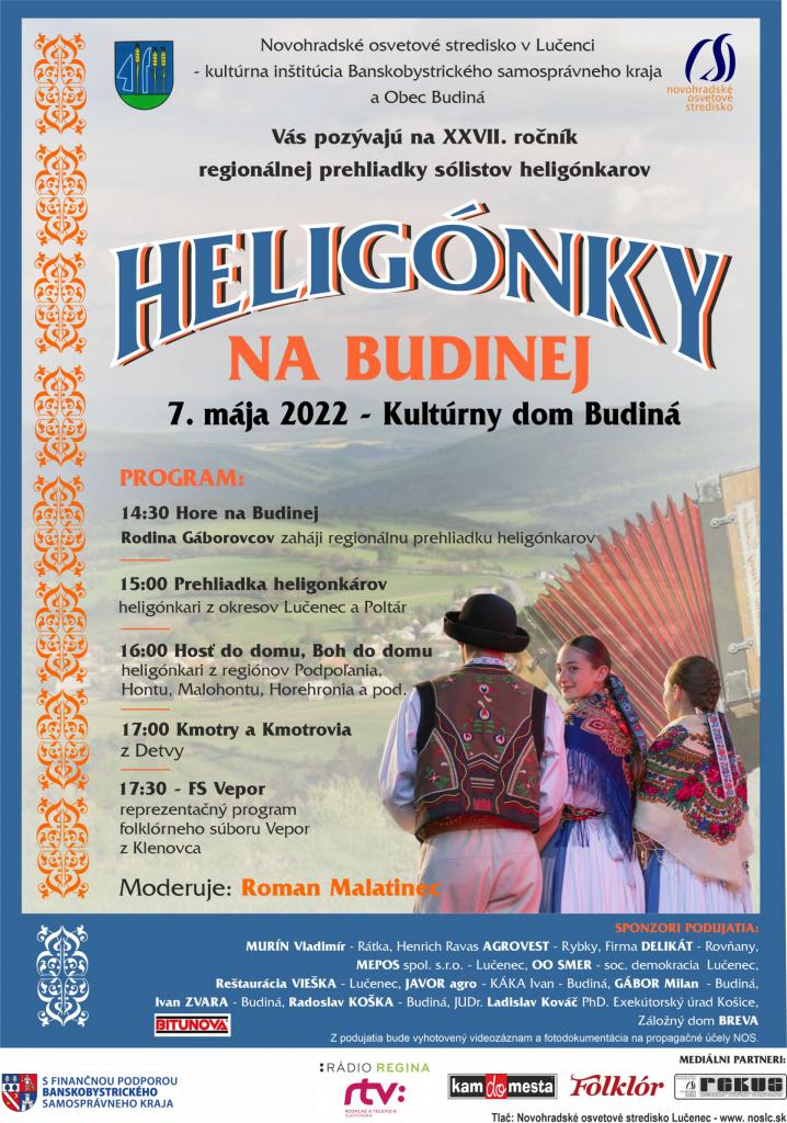Novohradské osvetové stredisko v Lučenci - kultúrna inštitúcia Banskobystrického samosprávneho kraja a Obec Budiná Vás pozývajú na XXVII. ročník regionálnej prehliadky sólistov heligónkarov.